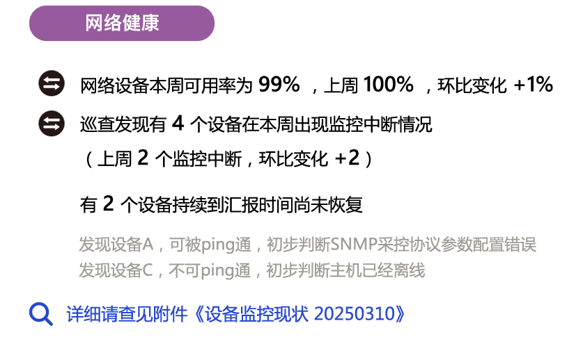 - 管理策略以最终决策为主要目标,比如以网络设备脱管问题为例,最终汇报不仅给出管理所需的脱管设备统计,同时对于尚未恢复的脱管设备进行主动分析,识别原因: