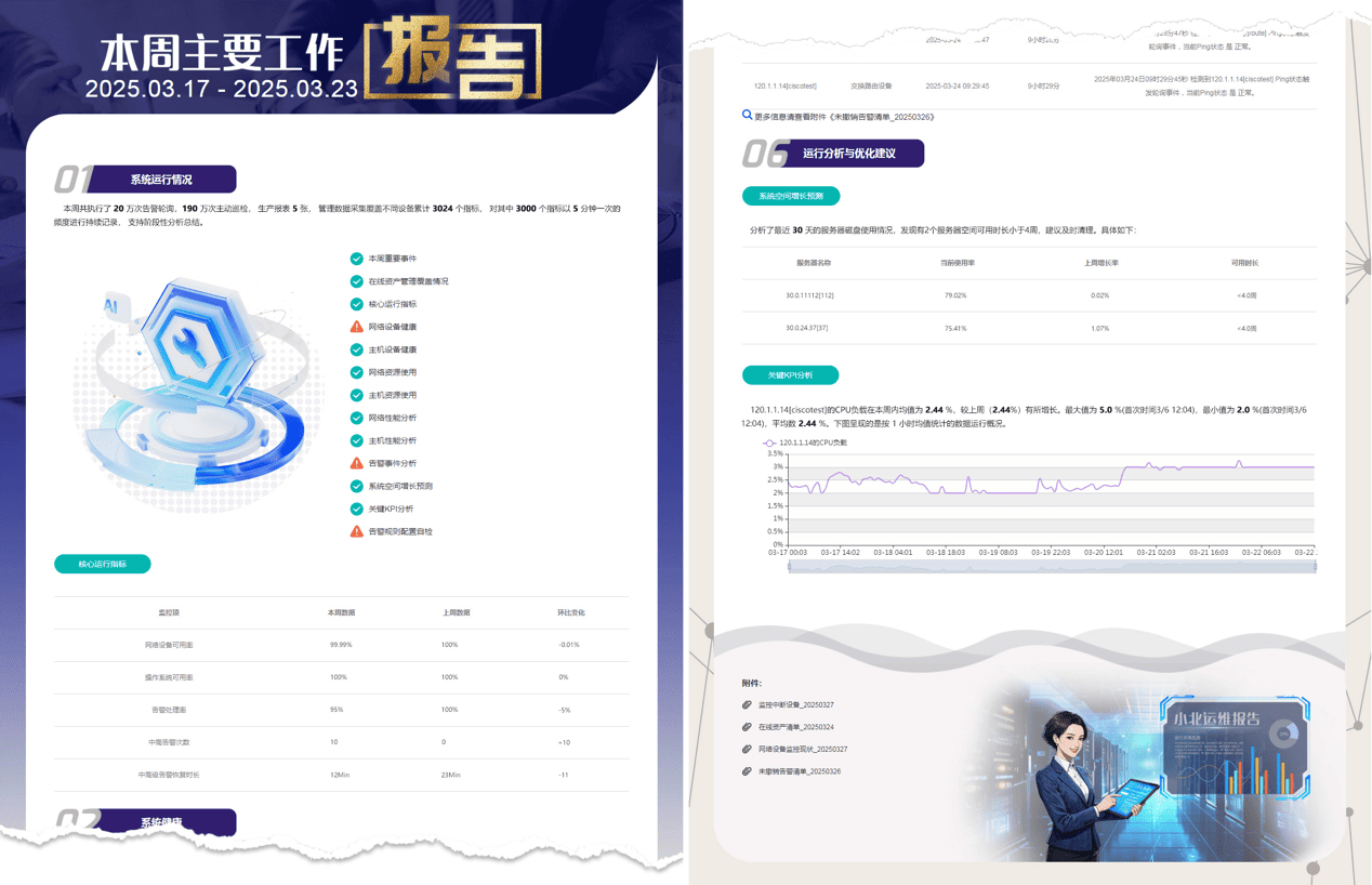 - 运维汇报允许分析多个主题,按照不同管理诉求和主题进行输出多份,通知多人。汇报以成果为主,汇报成果允许按照多种主题报告方式呈现,系统会以邮件方式通知,进一步提升运维的便捷性。