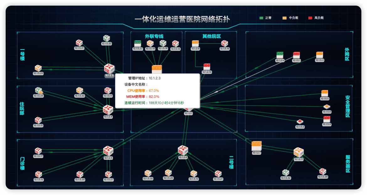 - 在故障处置场景中,图形化展示网络物理和逻辑是非常重要的手段,而可视化展示程度很大程度上会加快运维问题的排除和定位的效率。系统通过智能发现,实现网络关系的自动发现和展示,并以图标变色、图例方式显示CI对象的故障和高负载情况,协助用户快速在海量对象中,快速识别故障边界设备,并提供详尽的运行数据快速了解系统问题点,协助运维专职快速定位和解决问题。同时系统集成RemotePing、Webssh、Webtelnet、Web管理等多种工具,便于运维专职以拓扑图为运维入口,实现进一步问题定位和故障恢复。