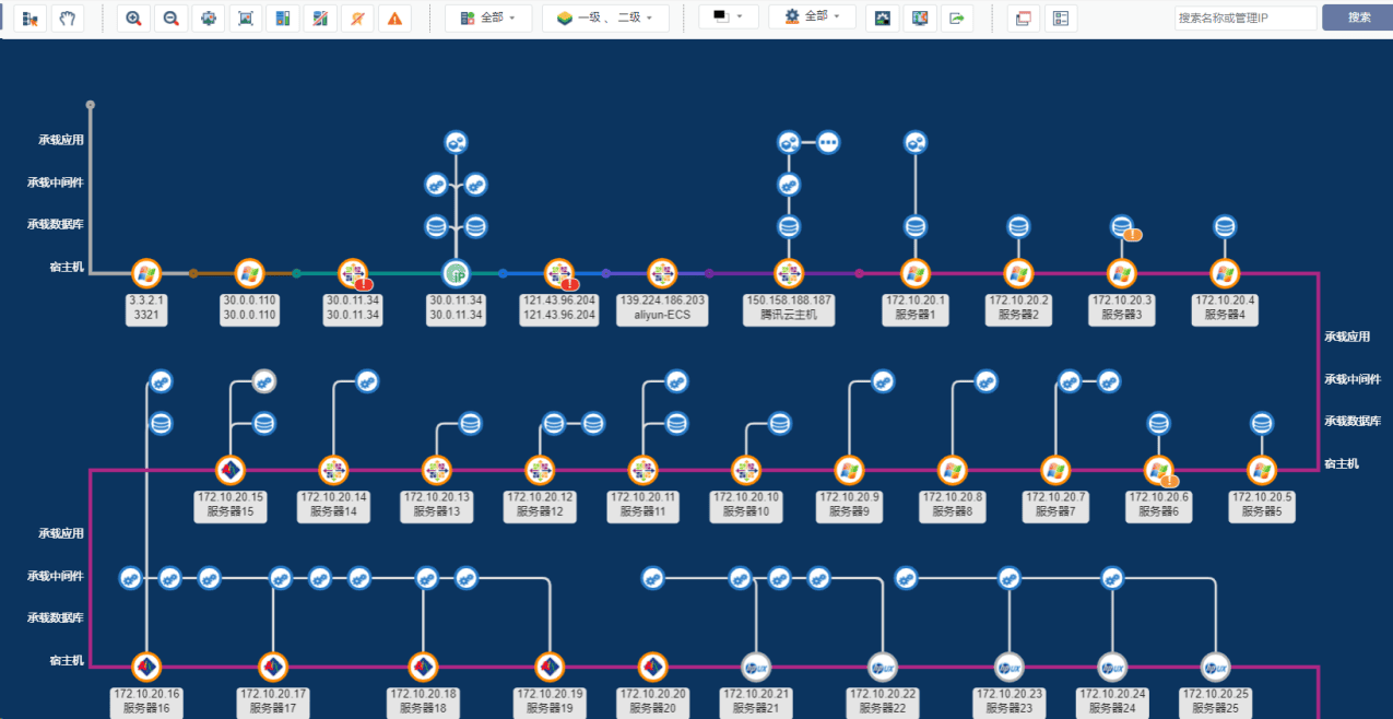 - 系统以系统拓扑方式,展示系统与应用软件的关系,并以图标颜色标识显示性能与告警状态,第一时间为用户呈现应用故障和系统之间的关系。