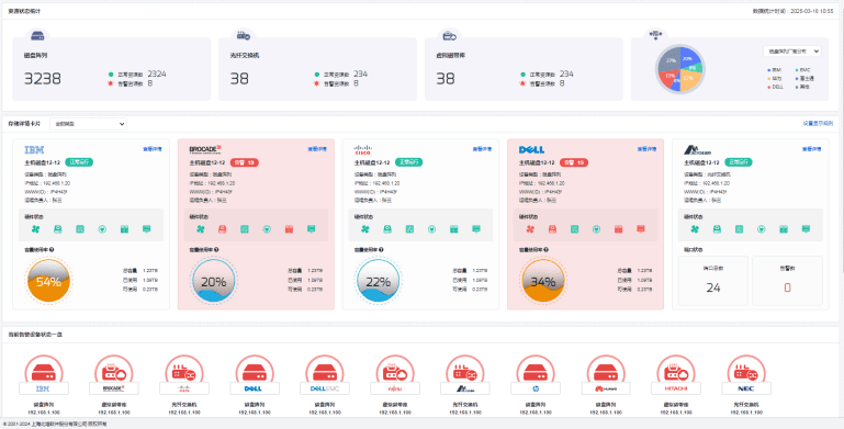 - 本系统采用设备级统一监控模型,突破传统存储架构限制,创新实现NAS、SAN、DAS等异构环境下的全设备纳管能力。通过构建与存储部署架构解耦的设备感知层,系统可精准识别超过40多类存储设备实体,实现从磁盘阵列、存储控制器到扩展柜的全栈式监控,确保不同存储架构中的设备资产均获得标准化、一致性管理体验。