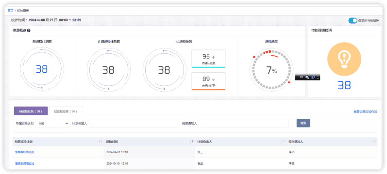 - 告警是系统24小时守护系统的经典检查方式,但是为了保证数据完整性,周期的执行更为深入的指标检测并形成管理报表,也是部分行业用户管理手段之一。本系统的智能巡检系统,能最大可能将可以自动巡检的项目自动执行,支持日、周多种类型的巡检周期,并形成服务管理诉求的巡检报告。