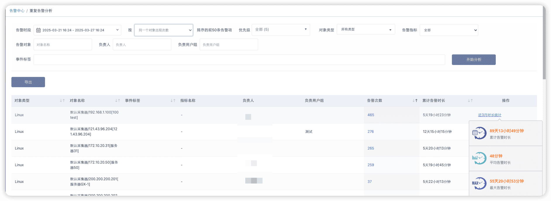 - 提供事后告警分析,从同一对象出现次数、同一对象的指标、同一类型的指标出现的次数分析历史告警情况,辅助判断普遍问题,从数据中提取管理抓手,从而提升故障预防的管理成效。