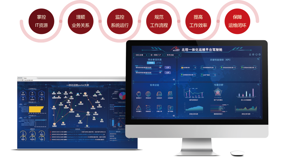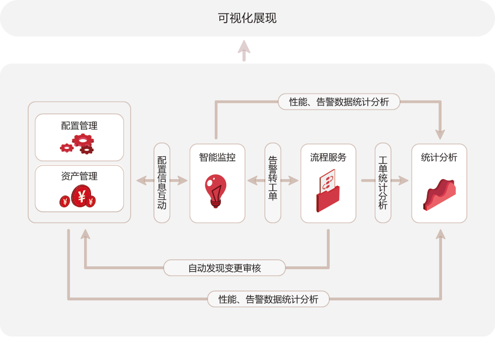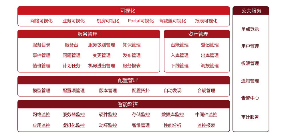 涵盖基础监控、资产、配置、流程服务等运维功能,实现运维闭环管理。
